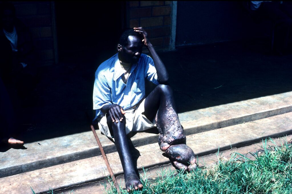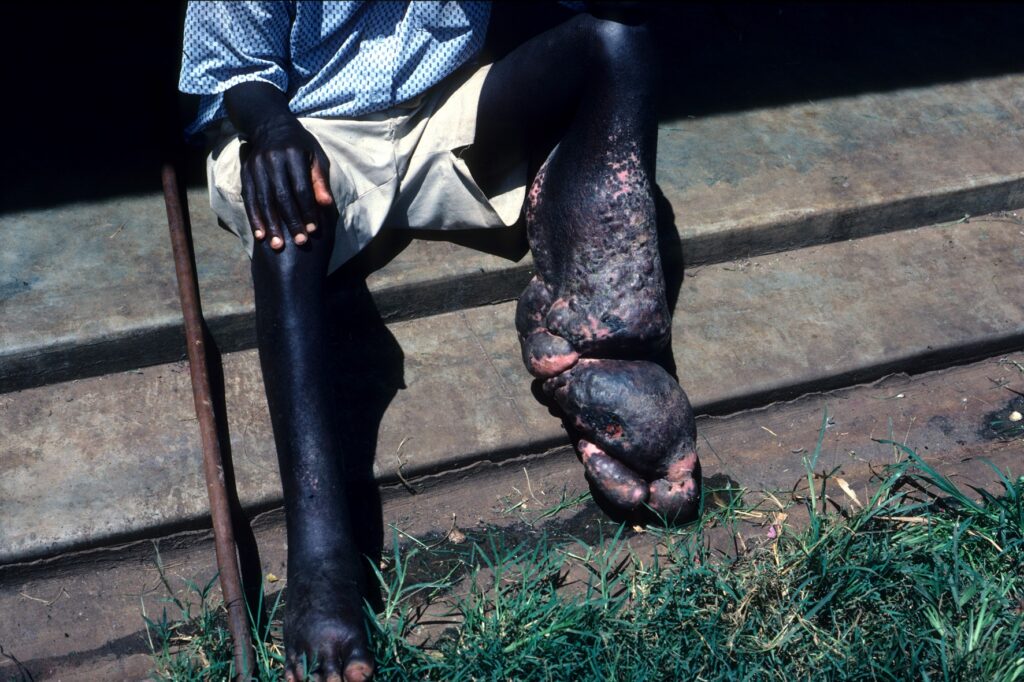 Een gezwollen linkerbeen bij elephantiasis, een worminfectie waarbij de lymfebanen worden geblokkeerd. Ook het rechterbeen is aangedaan en een beetje gezwollen.