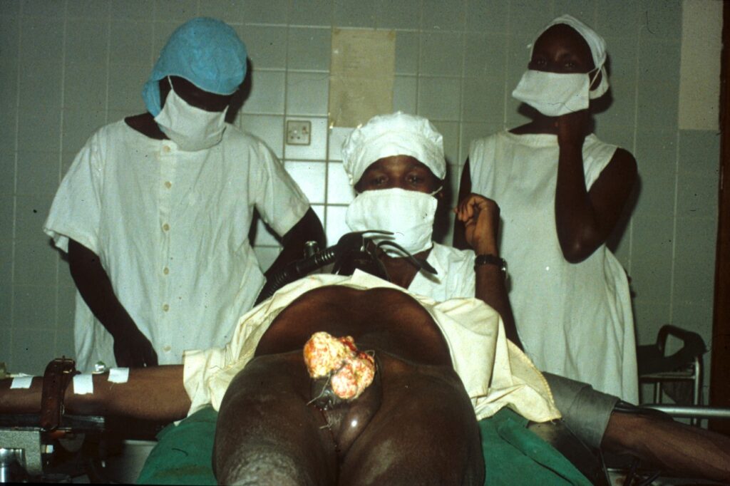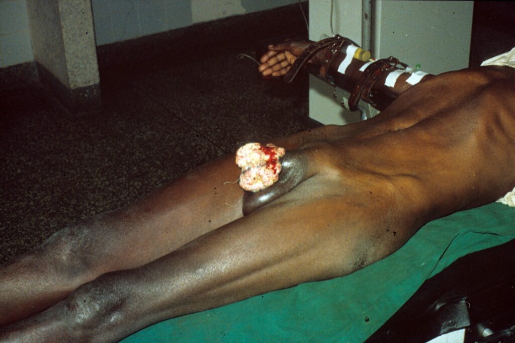 Peniscarcinoom. Er zijn opgezette lymfklieren in de liezen als teken van metastasen. Het operatieteam staat klaar voor amputatie.